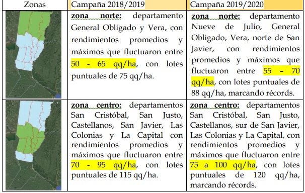 Condición que el sector productivo capitalizó, con un movimiento de equipos y cosechadoras que no se detuvieron, lo que posibilitó que el proceso de trilla alcanzara un grado de avance del 80 %, con 15 puntos porcentuales superiores a los de la campaña pasada, en comparación con el mismo período. Se lograron valores homogéneos y humedad de grano inferior al 15 %, situación de cosecha casi ideal, óptima, tan esperada por el productor. Los rendimientos promedios obtenidos en el período se mantuvieron similares y fueron consolidándose en cada zona donde se habían alcanzado valores récords, la semana anterior. Cuadro comparativo de rendimientos promedios y máximos, de las campañas 2018/2019 y 2019/2020, para similar período, reflejando las diferencias en los resultados y lo bueno a muy bueno que podría definirse el ciclo del maíz temprano