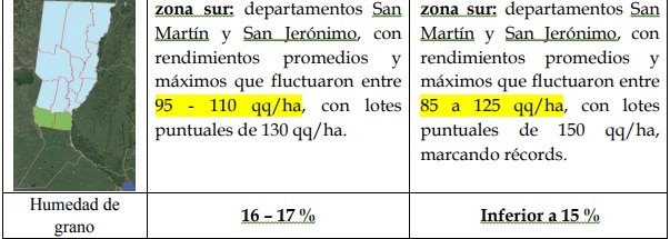 Zonas este-oeste: gran parte de la de la semana, transcurrió con días soleados, altas temperaturas, baja humedad ambiente, que continuaron brindando condiciones favorables para los cultivares sembrados en la primera etapa, más temprano. Dichas condiciones ambientales permitieron que el proceso de cosecha avanzara, fuera tomando ritmo y continuidad. Los rendimientos promedios obtenidos fueron superiores a 22 qq/ha, con mínimos de 15 qq/ha y máximos de 28 qq/ha, considerados por el sector productivo como buenos a muy buenos.
