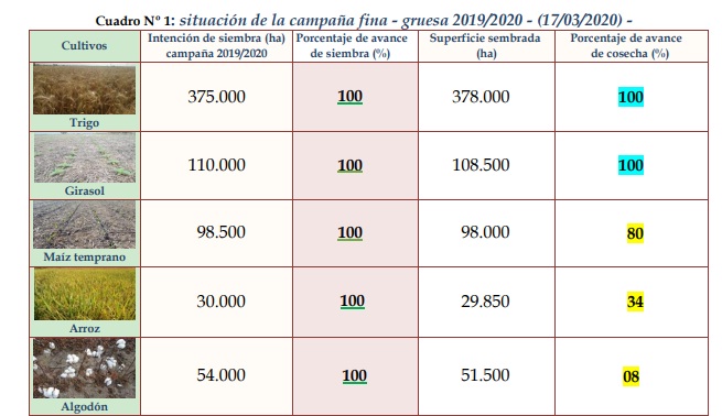 Los montos pluviométricos registrados oscilaron entre 30 y 80 mm, con la característica de que las lluvias fueron de intensidades medias a bajas, permitiendo una buena infiltración y recarga de los perfiles de los suelos. Las actividades agrícolas tuvieron diferentes grados de acción, siendo la cosecha de maíz temprano, el inicio de la cosecha de soja de primera, el monitoreo – seguimiento de los cultivares y las aplicaciones de herbicidas – insecticidas, a las que mayor cantidad de tiempo, se les dedicó. Por consiguiente, las tareas efectuadas en la semana fueron: a) monitoreo de trampas para capturas de picudos, en predios destinados al cultivo de algodón, b) aplicación de herbicidas en lotes sembrados, c) aplicación de reguladores de crecimiento en los cultivares de algodón, d) monitoreo y seguimiento de los cultivares de soja temprana y soja tardía, e) aplicación de insecticidas (control de orugas), f) monitoreo y seguimiento de los cultivares de maíz tardío (de segunda), g) cosecha de maíz temprano, h) cosecha de arroz, i) cosecha de algodón, j) cosecha de soja temprana. Para el período comprendido entre el miércoles 18 al martes 24 de marzo de 2020, los pronósticos prevén desde su inicio, condiciones de inestabilidad climática, con altas probabilidades de precipitaciones de variadas intensidades, en toda el área de estudio, con mayor impacto en el sur de la misma.