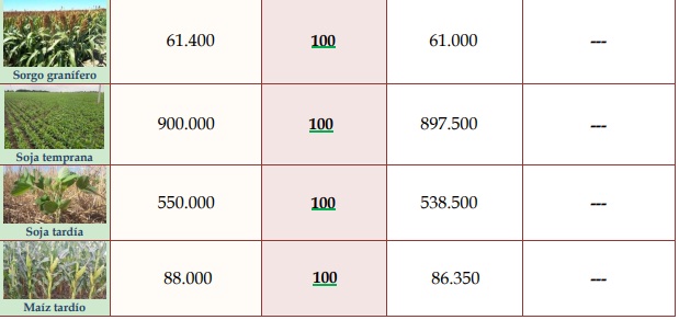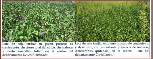 Las precipitaciones llegaron sobre el fin del período y con ello el alivio, pero consideradas “tardes”, ante lo avanzado del ciclo, con consecuencias irreversibles, no modificando la realidad de los diferentes estados fenológicos y su amplitud. Un 60 % se halló en estado bueno a muy bueno, un 20 % en estado bueno a regular, con mediano desarrollo de estructura de plantas, no llegando al cierre de los surcos, un 15 % regular y un 5 % malo. Desarrollo foliar limitado, estructuras de plantas medias a bajas, surcos no cerrados, amanchonamientos de lotes, pocos uniformes, mortandad de plantas, distintos indicadores que difícilmente cambiarían.