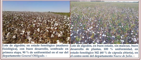 Diferente fue la realidad para los lotes sembrados en fechas más tardías y puntualmente, los que no estuvieron afectados por los excesos hídricos de mediados de febrero, área norte del departamento General Obligado, distrito Reconquista al norte, donde por condiciones de aptitud de suelos y situación 5 climática, el impacto del déficit hídrico y la ausencia de precipitaciones, afectó a los cultivos en diferentes grados y a la calidad de fibra, con consecuencias que se verían en los futuros rendimientos. En general, el estado del cultivo siguió siendo bueno, a excepción de los cultivares ubicados en los sitios mencionados. Se continuó recomendando a los productores la reactivación de las trampas para picudos en lotes donde la etapa de floración estuvo llegando a su fin, para la captura de los mismos o la baja de la población, en caso de su presencia.