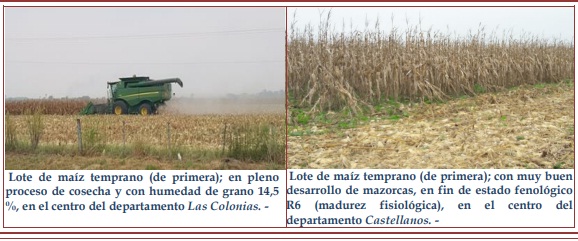 Situación que variaría a comienzos del jueves 19, desde el sector sur al norte, con condiciones de estabilidad climática, con temperaturas medias diarias estables y un leve ascenso de las mismas, con el transcurso de los días, escasa a nula nubosidad, sin 3 probabilidades de precipitaciones, registrándose escenarios de muy buen tiempo, permaneciendo las mismas hasta el final del período, en toda el área de estudio. Las temperaturas medias diarias fluctuarían, entre mínimas de 13 a 24 ºC y máximas de 25 a 34 ºC. – Maíz temprano (de primera) ✓ Las condiciones ambientales que reinaron durante la semana, en su gran mayoría de horas, tuvieron temperaturas diarias medias a altas, con registros térmicos cercanos a los 40 ºC, con bajos porcentajes de humedad ambiente, entorno seco, que permitió a los maizales un secado natural, uniforme y rápido.