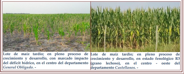 Para el caso de los implantados más temprano, que comenzaron el llenado de grano, período crítico y para los tardíos, en desarrollo de planta y foliar, las consecuencias serían irreversibles y se reflejarían en una disminución de los qq/ha finales. Se observaron los siguientes estados fenológicos: en V “estados vegetativos”, V4 (4º hoja desarrollada), V5 (5º hoja desarrollada), V6 (6º hoja desarrollada), V7 (7º hoja desarrollada), V8 (8º hoja desarrollada), V9 (9º hoja desarrollada), R “estados reproductivos” R1 (emergencia de estigma), R2 (cuaje, ampolla) y lotes más avanzados en R3 (grano lechoso).