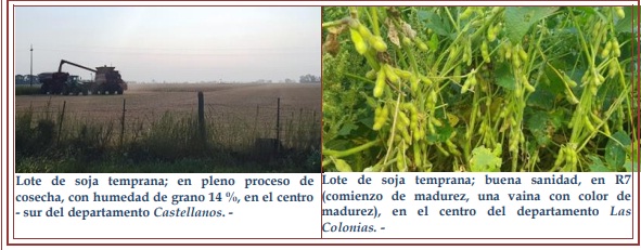 En un alto porcentaje los cultivares de soja temprana completaron el proceso de llenado de grano y el resto lo completaría, sin inconvenientes, en los próximos días. Un 97 % del cultivo se encontró en estado bueno a muy bueno con lotes excelentes, sin inconvenientes, un 2 % en estado bueno y el 1 % restante, regular. El estado sanitario siguió siendo bueno, sin problemas de importancia hasta la fecha.