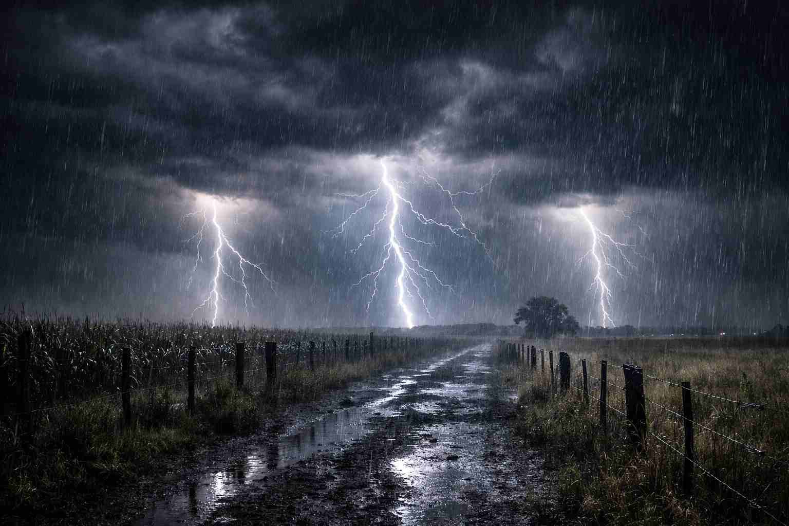 Tormenta severa durante la madrugada en un campo argentino, con rayos intensos, lluvia fuerte y camino rural inundado bajo cielo oscuro cargado de nubes