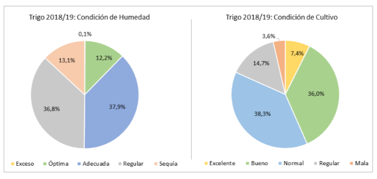 Durante la última semana se registraron precipitaciones heterogéneas sobre gran parte del área agrícola, permitiendo mejorar en parte la condición de humedad en lotes sembrados con trigo. A la fecha, el 50 % de las 6.100.000 hectáreas implantadas en la presente campaña mantienen un estado hídrico adecuado a óptimo, concentrado principalmente sobre las regiones del centro y sur del país. En cuanto al crecimiento y desarrollo del cereal, los lotes más adelantados comenzaron a llenar grano, mientras que en los núcleos trigueros de Buenos Aires el cereal continúa diferenciando etapas de macollaje y principios de encañazón.