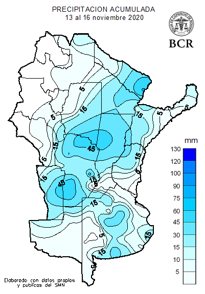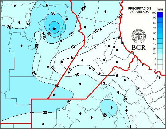 Desde Rosario hacia el oeste y hacia el noreste de Buenos Aires, las lluvias fueron muy escasas, con acumulados inferiores a los 10 mm.Esta vez el agua fue para las zonas mediterráneas. En Córdoba están los valores más altos, Bell Ville con 54 mm es el máximo registro acumulado. Le sigue Bengolea con 30 mm. En el sur de Santa Fe Rufino es el valor más alto con 28 mm. En el norte de Buenos Aires también se destaca Junín también con 28 mm. Los registros son muy oportunos para los maíces tempranos, pero en las zonas dónde las tormentas han pasado de largo señalan que “se necesitan más lluvias, pronto tendremos gran necesidad en la floración”.