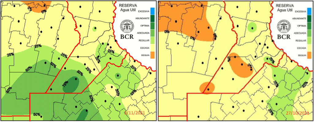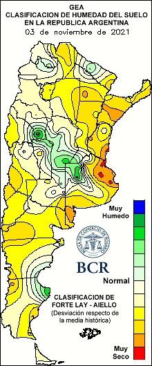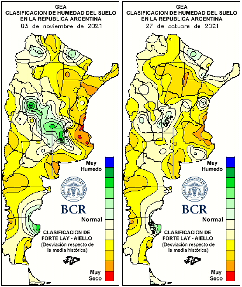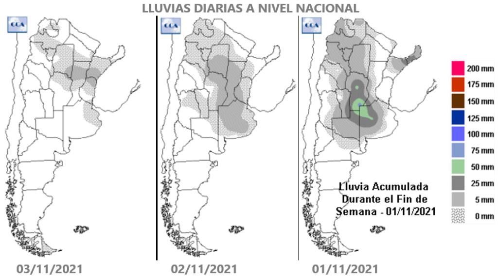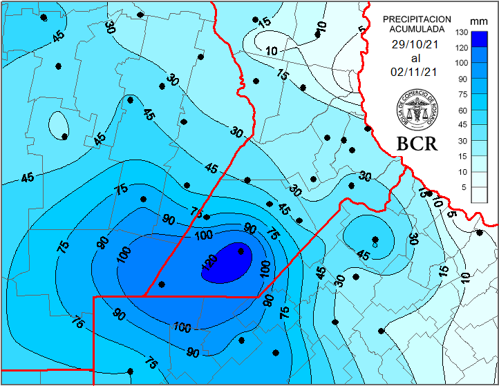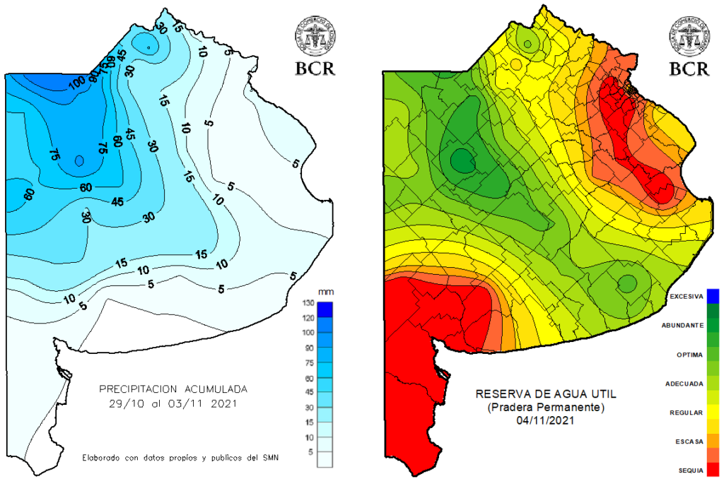 Los fenómenos de “tiempo extremo (severe weather)” volvieron a expresarse a pleno. Pero esta vez a favor de Argentina, porque si bien las lluvias cumplieron con la distribución que los modelos pronosticaban, no se esperaban montos de ésta magnitud. En el S de Córdoba, SO de Santa Fe, NO de Buenos Aires y NE de La Pampa hubo registros que superaron o estuvieron muy cerca de los 100 mm, cuando se esperaba menos de 20 mm. Si bien hace una semana Elorriaga decía: “la transición a noviembre muestra condiciones muy parecidas a las que se dieron antes de las importantes lluvias de inicios de setiembre” por lo que podía esperarse alguna sorpresa favorable, lo que sucedió superó por lejos las expectativas. El epicentro de las tormentas estuvo en el sur de Santa Fe con María Teresa registrando 136 mm entre los días 29/10 al 3/11. Córdoba es la provincia más favorecida por este evento: el 70% de su territorio recibió más de 30 mm, con el sur y centro oeste provincial superando las marcas de los 45 mm. En Santa Fe fue más acotado, sólo el 20% de la provincia superó los 30 mm. El dato destacado está en el sur santafesino: el departamento General López, que venía arrastrando una enorme deuda de milímitros, recibió esta vez más de 50 mm. La Pampa tambien recibió importantes registros en el NE con más de 30 mm en el 17% de su área.