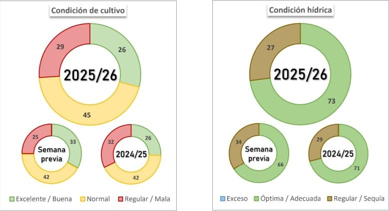 Actualmente, el 74% del área sembrada presenta una condición de cultivo que se ubica entre Normal y Excelente, un indicador que refuerza las expectativas productivas de cara a la cosecha.