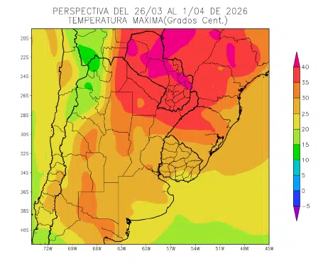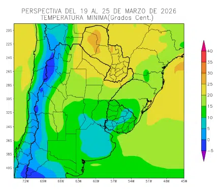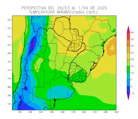 La perspectiva comenzará con temperaturas bajo normal, causadas por el paso de un frente en los días previos, pero los vientos del trópico retornarán con rapidez, produciendo temperaturas sobre la media en el norte del área agrícola, y registros normales sobre el centro y el sur, mientras la costa atlántica recibirá vientos marinos.