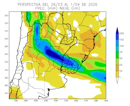 PERSPECTIVA AGROCLIMÁTICA DEL 26 DE MARZO AL 1 DE ABRIL DE 2026: PRECIPITACIONES CONCENTRADAS SOBRE UNA FRANJA DIAGONAL, CON ALTO RIESGO DE TORMENTAS LOCALIZADAS, QUE CORRERÁ DESDE EL NOA HASTA EL NORTE DEL URUGUAY, MIENTRAS LA MAYOR PARTE DEL ÁREA AGRÍCOLA