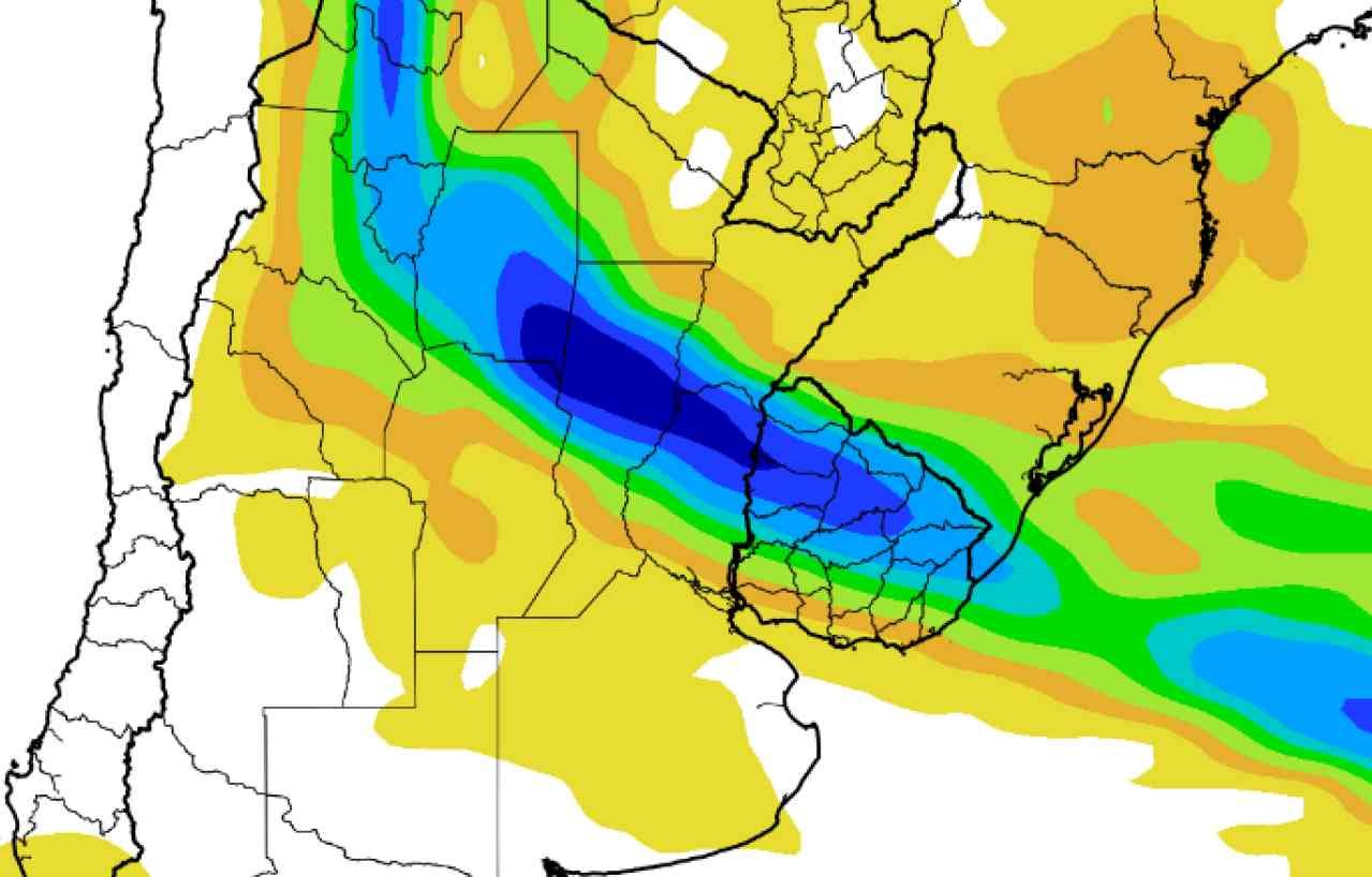 • El centro del NOA, el sudeste de Santiago del Estero, el centro de Santa Fe, el norte de Entre Ríos y el centro-oeste del Uruguay observarán focos de tormentas con precipitaciones superiores a 150 mm.