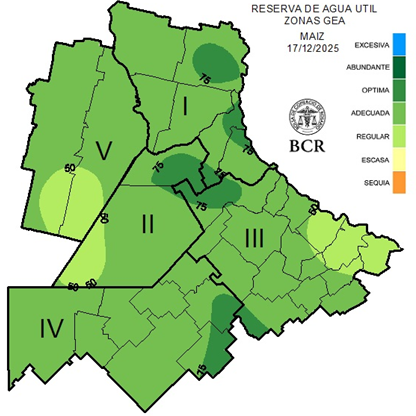 Diciembre marcó un quiebre en el régimen de lluvias, con tormentas desparejas pero estratégicas para los cultivos de la región núcleo. Durante el último fin de semana, las precipitaciones dejaron acumulados superiores a los 20 milímetros en el 75% del área, valores que resultaron clave para sostener al maíz temprano en pleno período crítico. En localidades como Hernando se registraron hasta 68 mm, en Rosario 55 mm y en Santa Teresa alrededor de 40 mm, mientras que desde el noroeste bonaerense al sudeste de Córdoba los registros fueron más modestos, por debajo de los 15 mm.