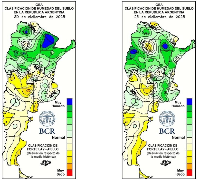 Este escenario, combinado con una persistente ola de calor, comenzó a reflejarse en las reservas de humedad de los suelos, que hacia fin de año pasaron a ubicarse mayormente en niveles regulares a escasos. El panorama recordó al de diciembre de 2024, cuando más de la mitad del área agrícola mostraba signos de estrés hídrico.