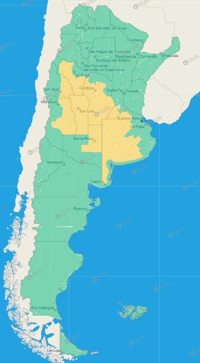 Buenos Aires: Norte de Bahía Blanca – Oeste de Patagones – Oeste de Villarino – Puan – Zona baja de Coronel Pringles – Zona baja de Coronel Suárez – Zona baja de Saavedra – Zona baja de Tornquist – Adolfo Alsina – Daireaux – Guaminí – Pellegrini – Salliqueló – Trenque Lauquen – Tres Lomas – General La Madrid – Laprida – Olavarría – Florentino Ameghino – General Villegas – Rivadavia – Bolívar – Carlos Casares – Carlos Tejedor – Hipólito Yrigoyen – Pehuajó – Alberti – Bragado – Chivilcoy – General Viamonte – Nueve de Julio – Veinticinco de Mayo – Adolfo Gonzales Chaves – Centro de Lobería – Norte de Coronel Dorrego – Norte de Necochea – Norte de San Cayetano – Norte de Tres Arroyos – Arrecifes – Capitán Sarmiento – Carmen de Areco – Chacabuco – Colón – General Arenales – General Pinto – Junín – Leandro N. Alem – Lincoln – Pergamino – Rojas – Salto – Zona serrana de Benito Juárez – Zona serrana de Lobería – Zona serrana de Necochea – Zona serrana de Tandil – Azul – Rauch – Tapalqué – Zona baja de Benito Juárez – Zona baja de Tandil