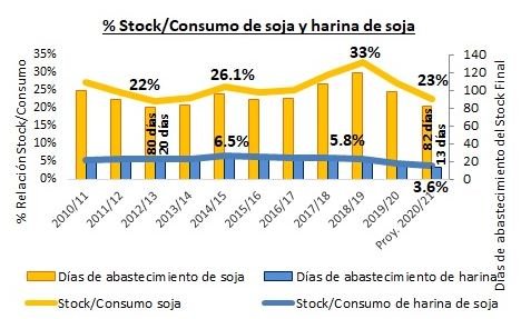 - ¿Cuántos días de abastecimiento representan el stock final mundial de grano de soja proyectado para la presente 20/21? 82 días de abastecimiento, es decir, casi tres meses, en caso que no hubiera abastecimiento de soja nueva.