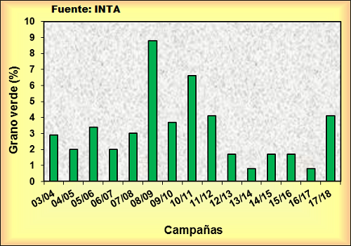 INTA afirma que el grano verde presentó un porcentaje de 3,8% en promedio en soja de 1ª con máximo de 17,2% y mínimo de 0,4%. En soja de 2ª siembra el porcentaje de grano verde fue de 4,6%. El promedio general de soja de 1ª y 2ª fue de 4,1%, igual a la campaña 11/12, versus 0,8% de la campaña 16/17.