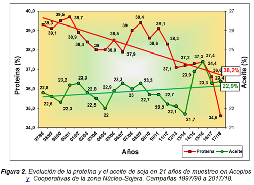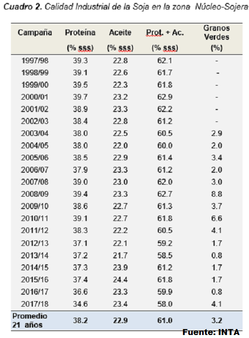 El artículo de INTA afirma que la sumatoria de Proteína+Aceite (PROFAT), en esta cosecha fue para soja de 1ª de 58,1% (59,7% campaña 16/17) y para soja de 2ª de 57,8 (60,1% de la campaña 16/17), con un promedio para el año de 58,0% (59,9% campaña 16/17), inferior en 3% al promedio de 21 años que fue de 61,0%.