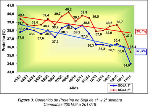 - El promedio de proteína en soja de 1ª fue de 34,0% un 2,0% inferior a la campaña 16/17 y en soja de 2ª de 35,4% un 2,1% inferior a la campaña anterior, con una diferencia entre ambas de 1,4 % a favor de soja de 2ª, con mínimo de 32,9% y máximo de 38,0%.