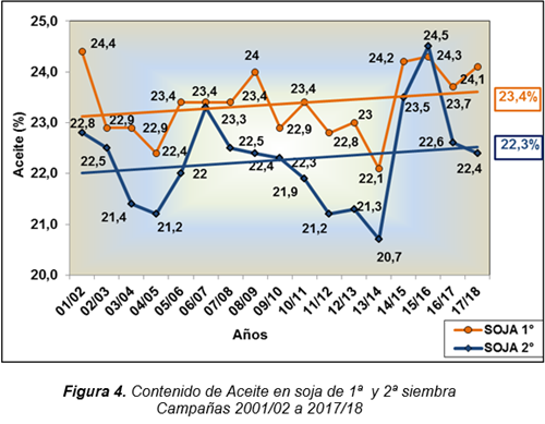 En la presente campaña, en soja de 1ª los valores fueron en general altos como ocurre todos los años, con un promedio de 24,1%, semejante a las tres últimas campañas, cumpliéndose la relación a mayor rinde mayor aceite. En soja de 2ª el contenido de aceite fue en promedio de 22,4%, un 1,7% inferior a la soja de 1ª.