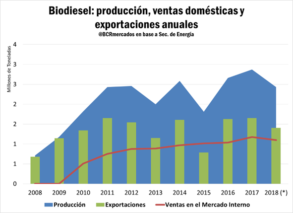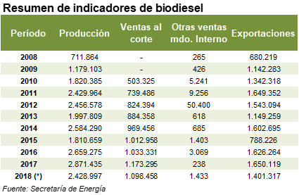 En el año 2018, de acuerdo a datos provisorios proporcionados por la Secretaría de Energía de la Nación, la producción de biodiesel de la República Argentina habría presentado una merma respecto al año anterior, al igual que las ventas en el mercado interno y las exportaciones.