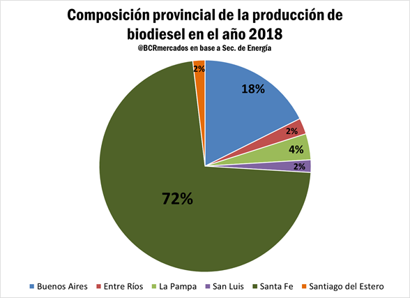 A continuación se analiza la composición provincial de la producción argentina de biodiesel. Se observa una clara concentración de la elaboración de biodiesel en la provincia de Santa Fe, seguida por la provincia de Buenos Aires. Si se toma como referencia el producto total del año 2018, que habría sido de 2,4 Mt., se observa que la provincia de Santa Fe concentra un 72,2% del mismo, seguida por Buenos Aires (17,6%), La Pampa (4,0%), Entre Ríos (2,4%), San Luis (1,9%) y Santiago del Estero (1,9%).