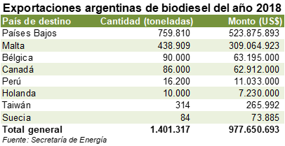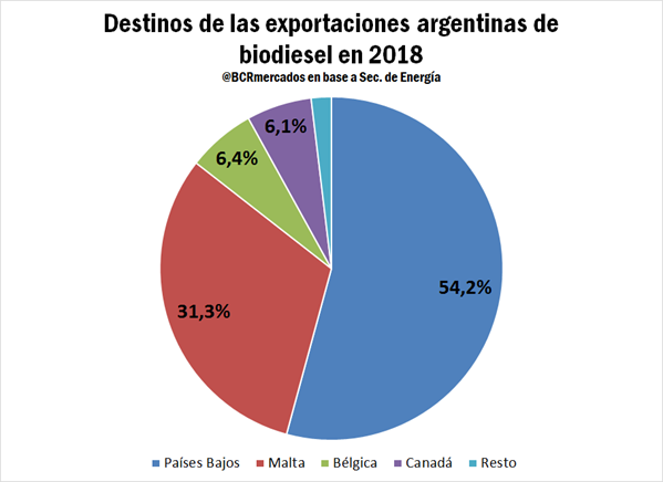 En cuanto a los destinos de las exportaciones de biodiesel, del análisis de los datos proporcionados por la Secretaría de Energía se desprende que de las 1,4 millones de toneladas enviadas al exterior en el año 2018, el 54,2% habría sido adquirido por los Países Bajos. El siguiente comprador, en orden de importancia, fue la República de Malta, a donde habrían ido el 31,2% de los despachos. Luego se ubican Bélgica y Canadá, que acapararon el 6,4 y 6,1% de las exportaciones argentinas de biodiesel, respectivamente. El restante 1,9% de las exportaciones se distribuye principalmente entre Perú y Holanda, aunque también hubo una participación marginal de Taiwán y Suecia.