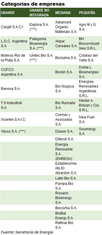 En cuanto a la composición de las empresas de biodiesel de la República Argentina, la Secretaría de Energía contabiliza un total de 36 firmas. De estas, hay 8 que son clasificadas como empresas grandes; 3 se consideran como grandes no integradas; 17 son medianas y 8 son empresas pequeñas.