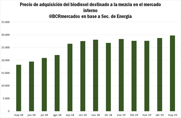 Indicador N° 5: En mayo de 2019, el precio del biodiesel para el mercado interno, de $ 29.739/t, contabiliza un aumento del 4,9% en lo que va del año.