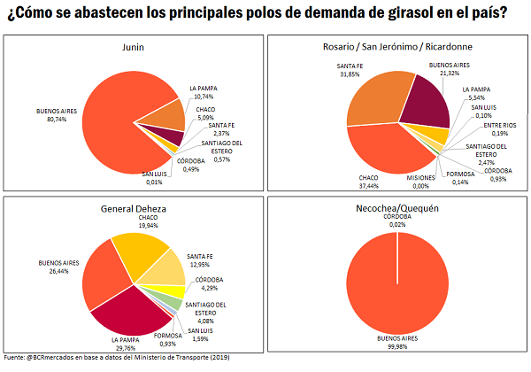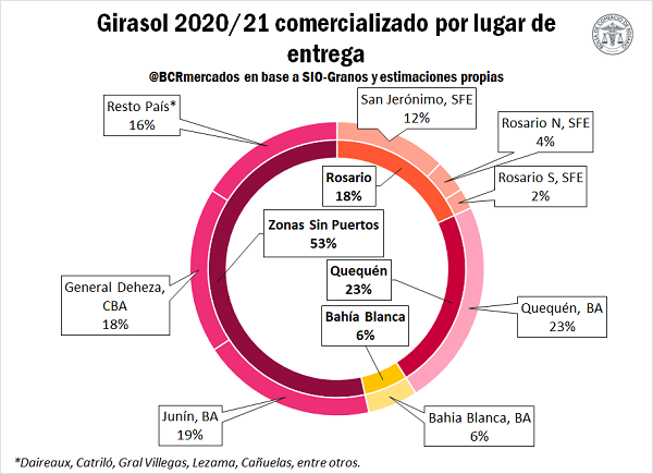 Respecto de las zonas sin puertos que se desprenden de los datos de SIO-Granos, del 53% del girasol recibido en la última campaña, la mayor parte se distribuye entre Junín (Provincia de Buenos Aires) y General Deheza (Córdoba). Estos dos polos de demanda de la oleaginosa recibieron el 19% y el 18% del girasol comercializado en la última campaña, respectivamente. El restante 16% se distribuye entre Daireaux (BA), General Villegas (BA), Lezama (BA) y Cañuelas (BA), entre otros.
