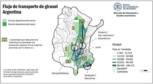Podemos analizar desde que zonas se abastece de mercadería a los centros de procesamiento y exportación en nuestro país. Para eso distinguimos cuatro zonas principales que se desprenden de lo analizado anteriormente: (1) la zona de Necochea / Quequén, en donde se encuentra la planta de crushing de la empresa Glencore, una de las de mayor capacidad de crushing individual para el tratamiento de la oleaginosa, además de encontrarse en esta zona los principales puertos desde donde se embarca el girasol en semilla. Por otro lado, tenemos el polo concentrador de los departamentos de (2) Rosario y San Lorenzo en Santa Fe, dentro de los cuales destacan San Jerónimo Sud, donde se encuentra la planta de procesamiento de la empresa Bunge, la localidad de Ricardone y Puerto San Martin, donde se encuentran plantas de procesamiento de Buyatti y Vicentín, y los puertos y plantas del Gran Rosario, donde destacamos la planta de Molinos Río de la Plata en esta localidad. Por otro lado (3) la localidad de Junín, en donde destaca la Fábrica de la empresa COFCO y (4) la localidad de General Deheza, en donde tenemos la fábrica de la empresa homónima (AGD). Podríamos identificar otro centro en el norte de la provincia de Santa Fe, entre las localidades de Avellaneda y Reconquista, aunque actualmente, producto principalmente de que la planta de la empresa Vicentín no se encontraría moliendo girasol, y la fábrica aceitera de Buyatti se focaliza principalmente en el crushing de soja, no significaría un polo de relevancia en la campaña. A su vez, destacan otros centros importantes de demanda que quedaron fuera del análisis por incluir solo los cuatro de mayor tracción de oferta, como pueden ser Bahía Blanca, Daireaux, entre otros.