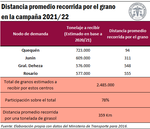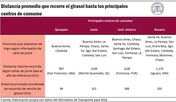 De esta manera, se puede apreciar que, a pesar de ser la provincia de Buenos Aires la principal productora de girasol y de tener dos de los principales centros de consumo en su territorio, dado que gran parte de la producción se origina en regiones más alejadas (el NEA particularmente), la distancia promedio que recorre una tonelada de girasol hacia los principales centros de consumo es considerable.