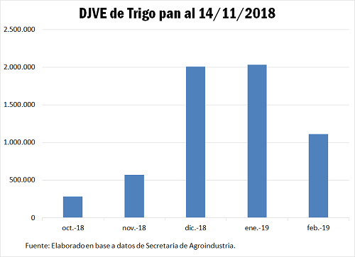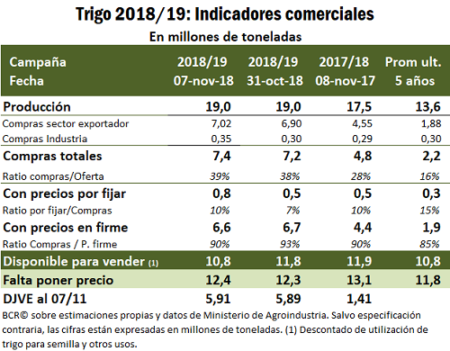 En tanto, el mercado está pendiente de esto por lo que el ritmo de operaciones se acelera. Los negocios por trigo, en los últimos 7 días (viernes 9 a jueves 15), aumentaron en volumen operado respecto a la semana anterior en todos los segmentos. Según información oficial, el volumen negociado con entrega hasta 30 días (negocios a noviembre/diciembre) ascendió a 112,3 mil toneladas doblando lo negociado en la semana anterior. Este segmento es el que más ha acaparado la atención de los operadores en el recinto de operaciones de la BCR. Con menos volumen, pero incrementándose respecto a la semana anterior, se asoman las operaciones para la segunda quincena de diciembre y primeros días de enero llegando a 25 mil toneladas operadas en la semana. El diferido para los meses de febrero, marzo y julio alcanzó un total negociado de más de 43 mil toneladas. Según fuentes del mercado, el ingreso de la mercadería a la terminales se podría atrasar por las últimas lluvias acontecidas. Fuentes del mercado aseguran que esto podría ocasionar un cuello de botella en los puertos exportadores debido al gran volumen de forwards realizados para estas fechas, si el ritmo de embarque no se mantiene alto. Para tener una idea de este incremento, basta con mirar las cifras de comercialización del sector. Al 7 de noviembre se lleva vendido más del 39 % de la cosecha de trigo, siendo un valor muy por encima de campañas anteriores. Las DJVE a la misma fecha alcanzan 5,91 Mt mientras que el año pasado este valor apenas superaba 1,4 Mt. El 80 % de estas DJVE están declaradas para los meses de noviembre, diciembre y enero.