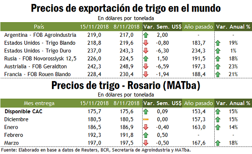 En materia precios, tanto el disponible como los futuros de trigo tuvieron muy poca variabilidad en la semana. El precio anunciado por la Cámara Arbitral de la BCR se fijó al día jueves 15 en $ 6.300/t, $ 100 por encima de la semana anterior. Medido en dólares, el precio prácticamente no tuvo variación, equivalente a US$ 175,7/t. El mismo rango acotado de variación se evidenció en el diferido de MATba para diciembre, enero, febrero y marzo.