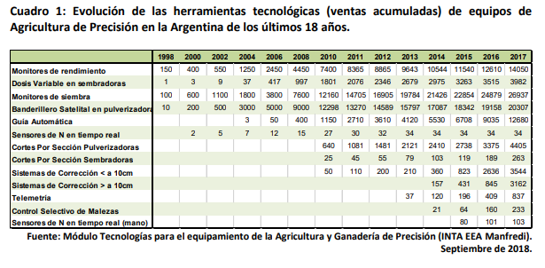 Después de más de 20 años de AGRICULTURA DE PRECISIÓN (AP) en Argentina se puede afirmar que las tecnologías avanzaron y evolucionaron hacia procesos totalmente digitalizados, sensorizados y automatizados. Es así que hay variados ejemplos de nuevas tecnologías y conceptos de futuros desarrollos que tienen varios años de validación, como los tractores autónomos, los sistemas de pulverización selectiva por sensores activos, pasivos y de visión artificial, sistemas totalmente automatizados para la autoregulación en cosechadoras, en función de las características del cultivo que se está cosechando, sensores en las sembradoras que detectan diferentes parámetros en el suelo y permiten su caracterización según ambiente logrando una dosificación variable metro a metro. En consonancia, Argentina no queda fuera de esta revolución tecnológica, participando con desarrollos orientados en la misma línea que las empresas multinacionales y los países desarrollados. Vemos los sistemas de guiado automático de la maquinaria con giro en cabecera, sistemas de telemetría de los diferentes vehículos y herramientas, sistemas de cámaras de visión artificial capaces de lograr una aplicación selectiva en malezas, utilización de motores eléctricos para comandar de manera precisa los dosificadores de siembra, entre otros tantos desarrollos.