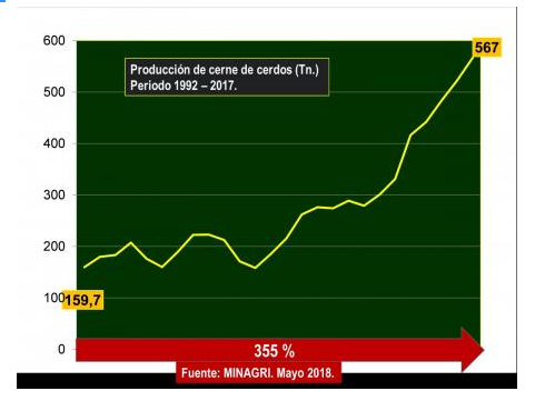 Según cifras oficiales del Ministerio de Agroindustria, la producción nacional de carne porcina creció en forma sostenida un 355% en los últimos 25 años. Sin embargo el país no se autoabastece, por el gran aumento en el consumo interno, un indicador positivo para el futuro de la producción.