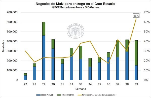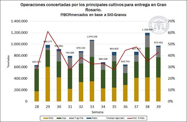 En cuanto al volumen operado con destino a la región del Gran Rosario, el registro SIOGranos, muestra negocios por 970.000 toneladas en la última semana, entre el 17 y el 23 de septiembre. Con ello, se nota una caída en la actividad comercial respecto al importante volumen operado la semana previa.