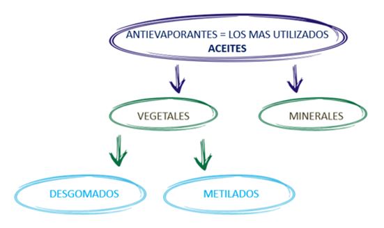 En la actualidad los más generalizados para uso agrícola son aceites vegetales y dentro de este, los aceites metilados, que tienen efecto antievaporante y penetrante, no siendo así los desgomados que solamente son antievaportante, pero vemos que su uso ya no es tan masivo.