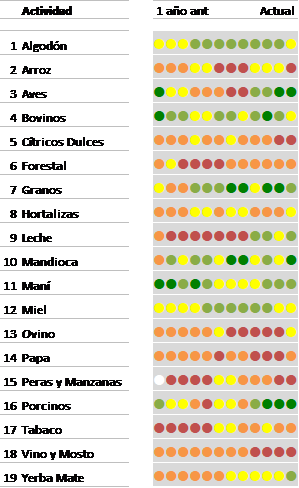 Los 5 amarillos: Algodón, Bovinos, Hortalizas, Miel y Ovinos. Se destaca la actividad bovina de carne que ingresa en esta categoría por los menores volúmenes de producción.