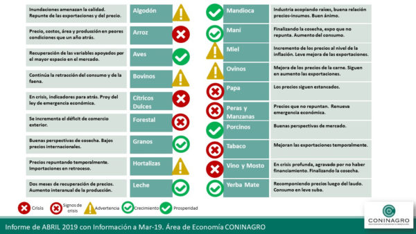 Los 7 rojos: Vino, Cítricos Dulces, Papa, Peras y Manzanas, Forestación y Arroz. Su estado actual se explica mayormente por tener costos más altos que los precios, destinar gran parte de su producción al mercado interno, teniendo su consumo estancado y exportaciones que no repuntan.