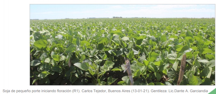 Finalmente, hacia el sur, mejora la oferta hídrica tras las precipitaciones registradas el pasado 4 y 10 de enero. Actualmente el cultivo se encuentra iniciando floración (R1) con un escaso tamaño de planta. Sectores sobre el Sudeste y Sudoeste de Buenos Aires reportaron fallas en la emergencia y pérdidas de plantas, sin embargo, se espera que un mayor crecimiento y ramificación compense la pérdida en el stand de plantas.