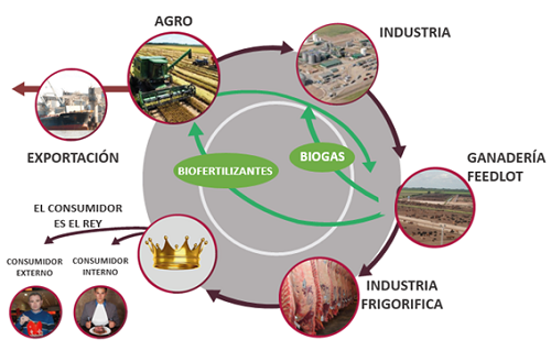 A su vez, de esta cadena surgen bienes de donde antes solo se veían desperdicios. Nos referimos al biogás y biofertilizantes, producidos con los desechos de la actividad. De esta manera la bioeconomía entra a jugar un papel trascendental. Esta generación de nuevos subproductos se dirigen nuevamente hacia el agro, retroalimentando esta nueva tendencia de la economía circular.