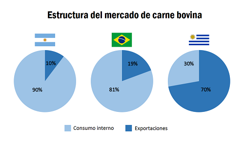 Otros países de la región como Uruguay que posee una matriz de faena orientada en un 70 % al exterior y solamente el 30 % al mercado interno, posee una industria frigorífica bastante concentrada y con signos de cartelización en la definición de precios de compra de hacienda. Uruguay habilitó hace unos años la exportación en pie de novillos enteros a diversos países -principalmente a Turquía- permitiendo de esta forma mantener los precios internos de la hacienda relativamente tonificados. Estos son otros modelos de políticas activas que sin dejar sin hacienda a la industria instalada, le permite obtener a los productores un piso de rentabilidad.