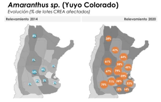 El yuyo colorado (Amaranthus sp.) resistente a herbicidas, que apenas seis años atrás era una curiosidad, en la actualidad constituye el principal problema en materia de malezas de difícil control, seguido inmediatamente por rama negra (Conyza sp.) y raigrás (Lolium sp.) resistente.