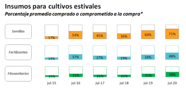 Los referentes CREA consultados habían efectivizado o comprometido la compra en el pasado mes de julio del 71% del total de las adquisiciones programadas de semillas para la campaña gruesa 2020/21, mientras que en el caso de los fertilizantes y fitosanitarios esa proporción era del 48%. En las tres situaciones se trata del mayor nivel registrado en el último lustro.