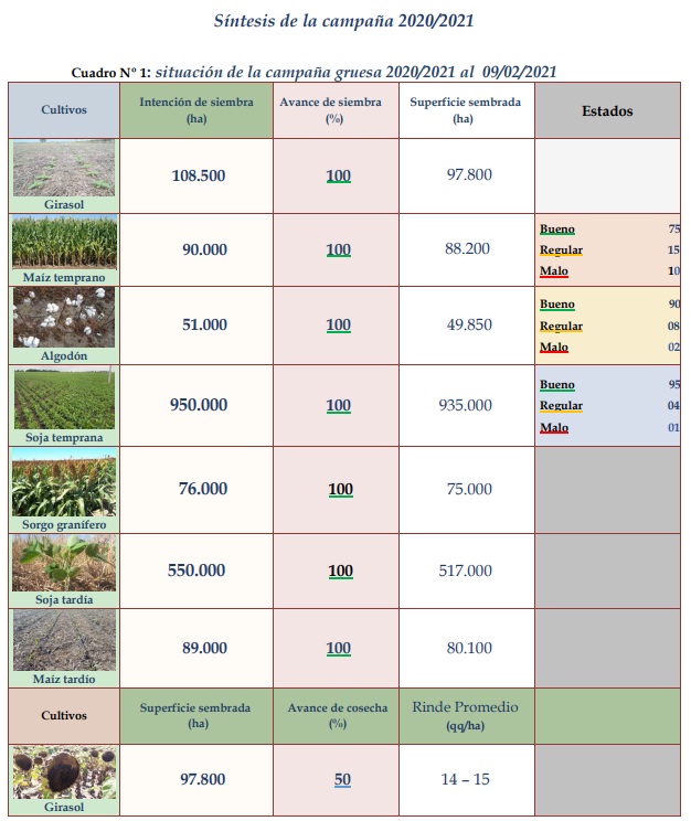 Con el transcurso de los días, mejoraron lentamente las condiciones físicas de los suelos, la transitabilidad de los caminos y la accesibilidad a los lotes, lo que posibilitó el ingreso de equipos y cosechadoras, reanudándose así, el proceso de recolección del girasol con diferentes ritmos, según cada departamento, lográndose un grado de avance del orden del 50 % y de 2 puntos porcentuales intersemanal.