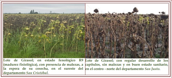 El enmalezamiento de los distintos sitios continuó siendo el principal inconveniente, acrecentándose en estos días al momento de la cosecha, como consecuencia del menor desarrollo de las plantas, lo que favoreció la aparición de malezas, dada la mayor luminosidad entre surcos y humedad edáfica, por lo que se efectuaron aplicaciones de herbicidas, antes de la recolección. Los girasoles presentaron muy buena sanidad, sin inconvenientes, pero en lotes más avanzados, en estadio de fructificación, continuaron observándose daños por ataques de palomas y de cotorras, principalmente en los departamentos del centro y sur del área de estudio. Se detectaron los siguientes estados fenológicos; R “estados reproductivos”, R7 (la parte de atrás del capítulo comenzó a ponerse amarillento), en los departamentos del centro – sur del SEA y en el norte, lotes más avanzados, en R9 “madurez fisiológica” (parte de atrás del capítulo y las brácteas de color amarillento a marrón oscuro).