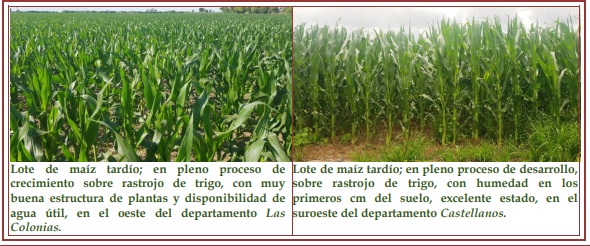 Lote maíz tardío, sobre rastrojo de trigo, en estado muy bueno a excelente, en el centro del departamento Castellanos.