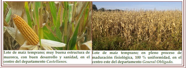 Estos dos últimos casos, se evidenciaron en mayor proporción, en suelos con aptitudes agrícolas no ideales o con ciertas limitantes. En el área de influencia de las cuencas lecheras del centro – norte santafesino, el proceso de picado – embolsado, con destino al autoconsumo, solo se realizó en unas pocas parcelas, manteniéndose los buenos resultados, en cuanto a calidad y a cantidad. Un porcentaje de los mismos, ante los eventos climáticos y las nuevas condiciones ambientales avanzaron en sus etapas fenológicas, pasando su destino a grano comercial. No se detectaron inconvenientes sanitarios por plagas o enfermedades. Se observaron los siguientes estados fenológicos: R “estados reproductivos”, R2 (cuaje-ampolla), R3 (grano lechoso), R4 (grano pastoso), R5 (grano dentado) y en lotes más avanzados, en comienzo de R6 (madurez fisiológica).