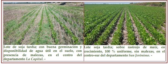 Continuó observándose una recuperación de los sojales, como consecuencia de las condiciones ambientales que reinaron en los últimos veintisiete días, que favorecieron su normal crecimiento. Por lo cual se observó un 95 % en estado bueno a muy bueno con lotes excelentes, un 4 % regular y un 1 % malo.